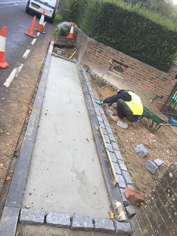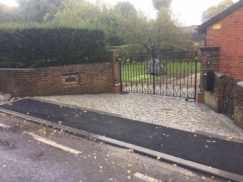 After excavating this entrance to the driveway we installed a new sub-base and road kerb as the customer was having water issue from rain water running of the road into the property. We re set the levels of the driveway to prevent this happening. New Granite setts have been laid in concrete and pointed. A tarmac crossover was also installed. The granite setts really compliment the style of the property.