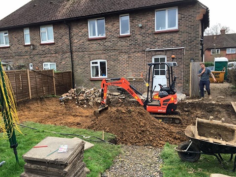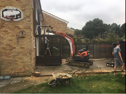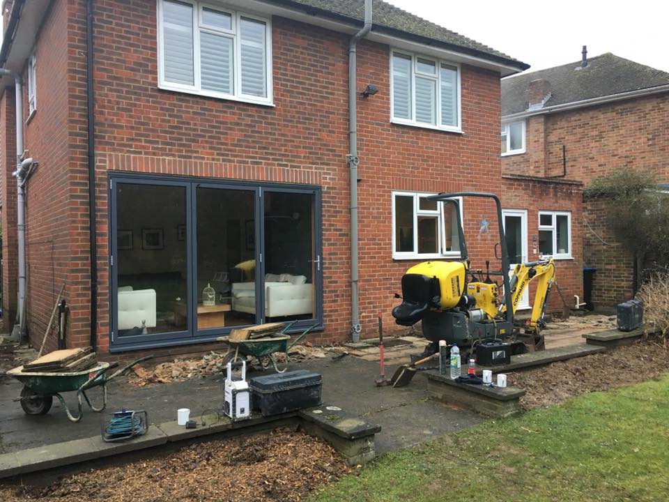 An extension project in Hurst Green, We Extended the property providing a large open plan kitchen with bi-fold dooe yo rs for them warm summers days. A nice size patio area and retaining oak sleeper walls levelling the garden.