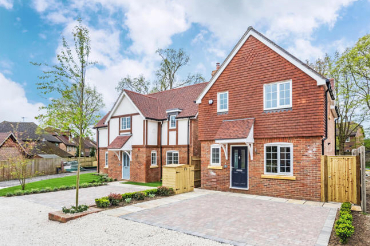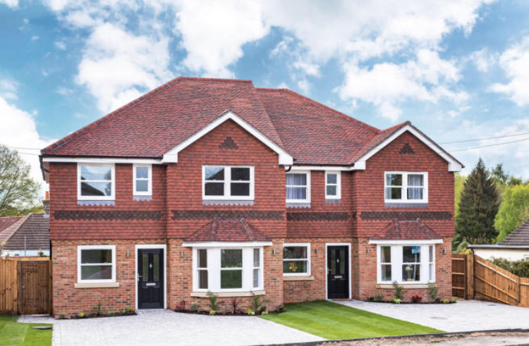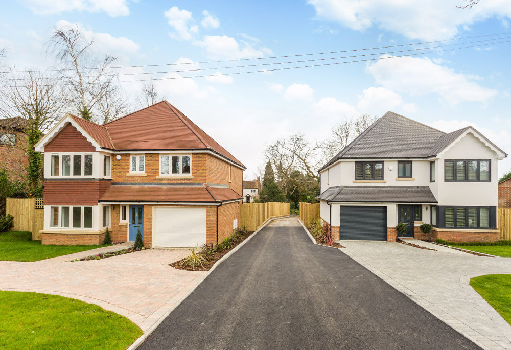 Setting out and forming the blueprint for this pair of semi-detached new builds we also erected the brickwork for the same build in Felbridge, Surrey. On each plot we have installed stone window sills provding a neat soild look. We have also added curved lintels above the windows addding some fine detail.