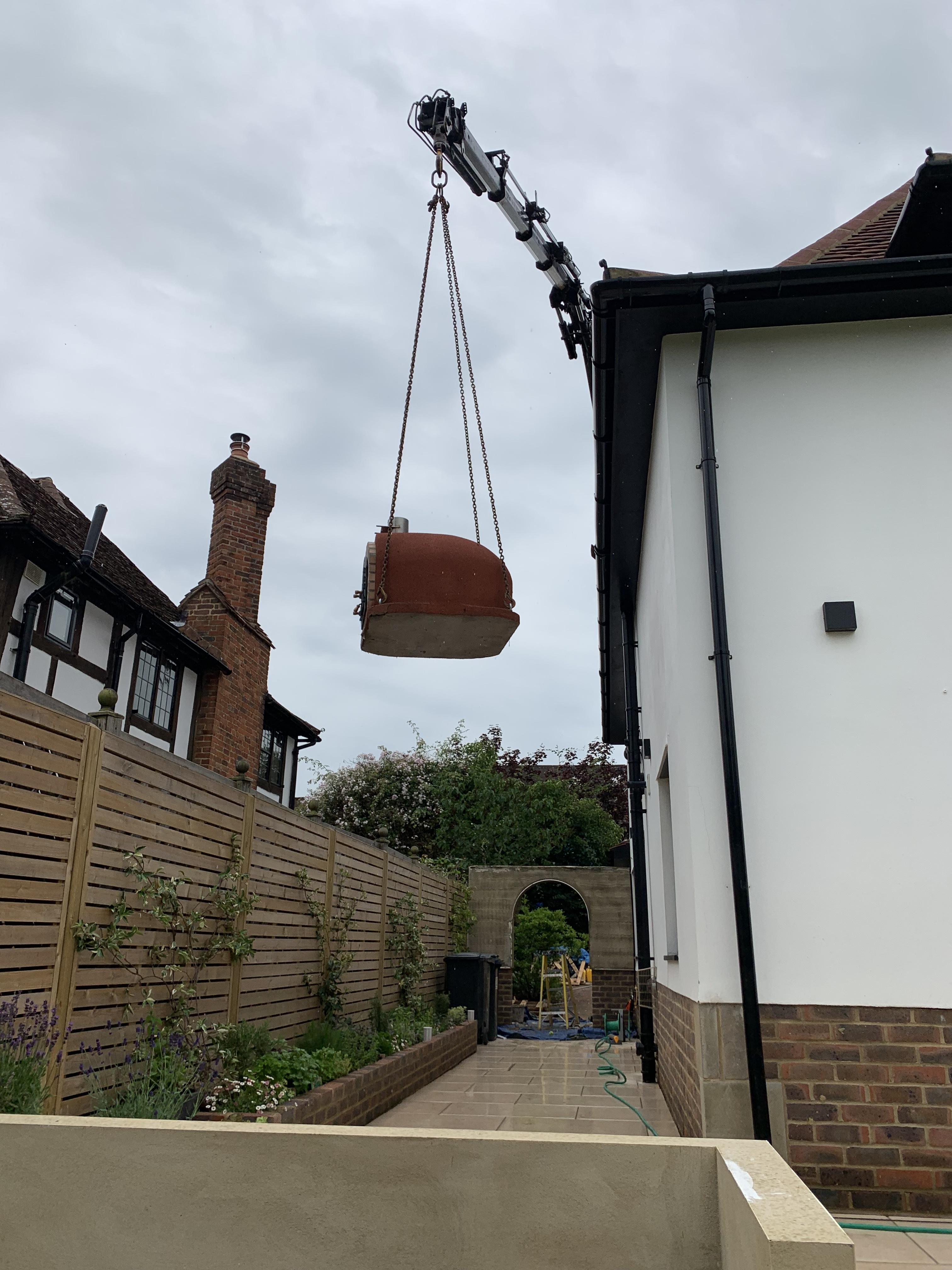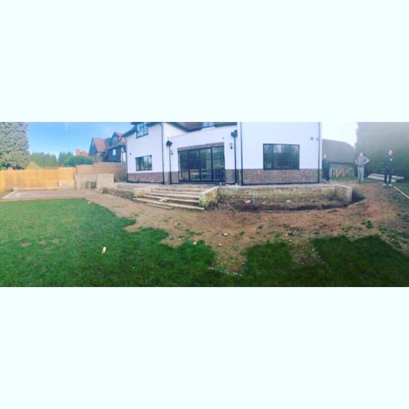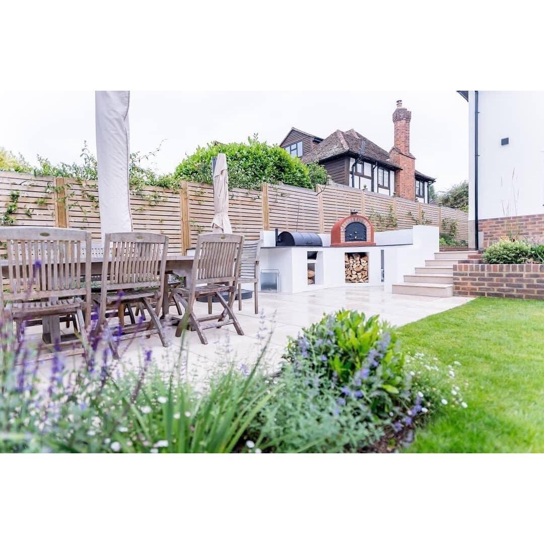 This lovely couple in oxted ended up unfortunately having some bad experiences with 2 landscaping companies prior to us starting the works which needed to be carried out. We demolished what was left and started over forming this spectacular Garden, installing new retaining walls and brick planters. We also formed and exterior kitchen with a granite worktops. A 1 tonne pizza oven was then lifted over the house using a crane to install it onto the new worktop.